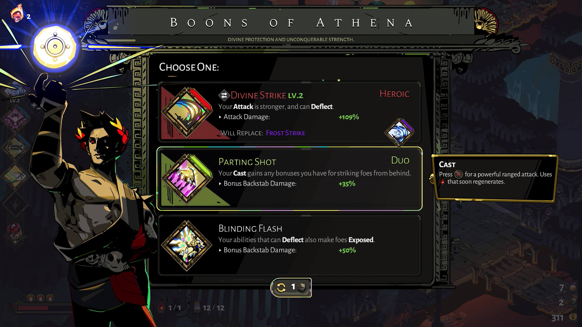 獲得時は、3つの選択肢の中から好きな強化を選択する。この強化は現在の挑戦時のみ有効で、死亡時には全て失われる。