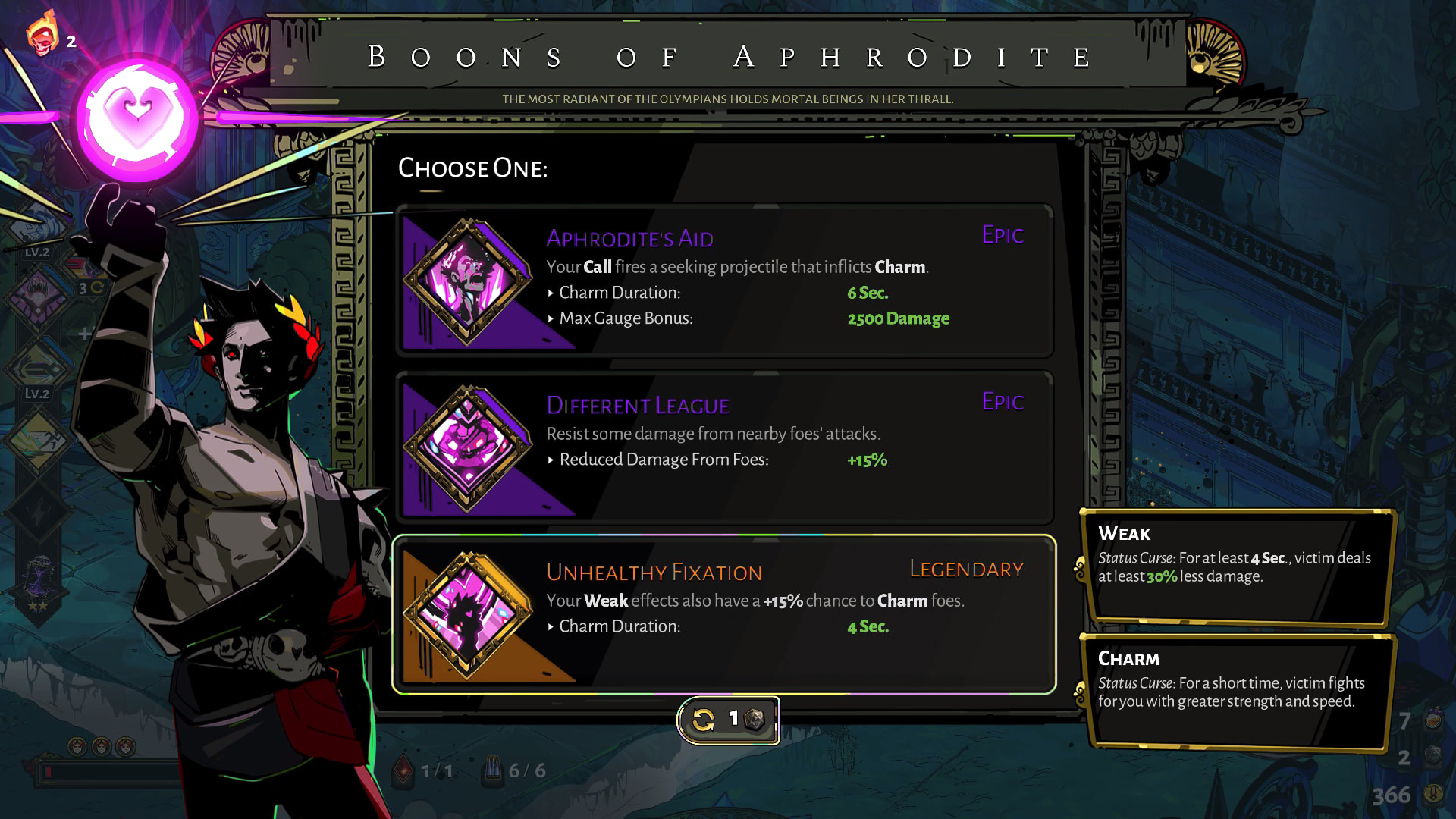 ![]() アフロディテ | 腕力低下と魅了付与、生存能力の向上。 |