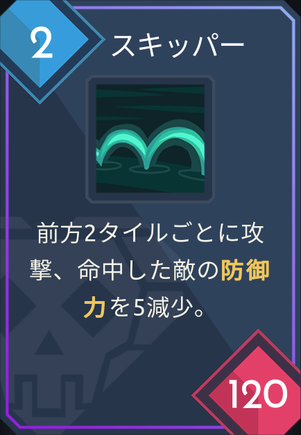 前方2タイルごとに攻撃、命中した敵の防御力を5減少。