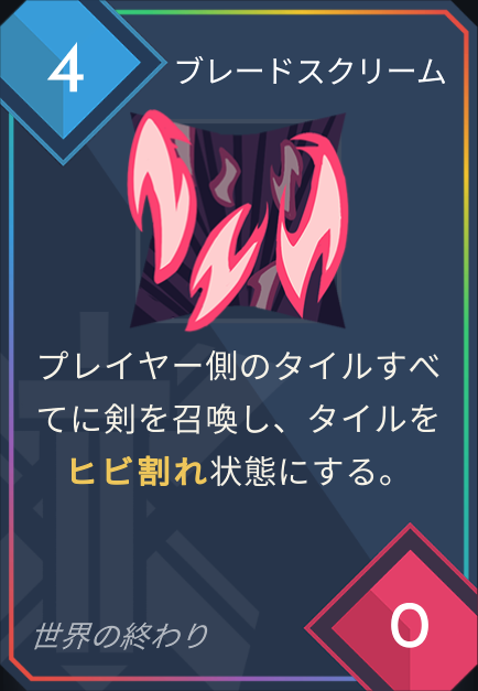名前 ブレードスクリーム コスト 4 ダメージ 0 効果 プレイヤー側のタイルすべてに剣を召喚し、タイルをヒビ割れ状態にする。 ブランド Slashfik レアリティ Calamity 仕様 解説 関連ページ