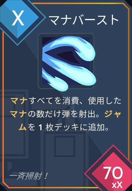 名前 マナバースト コスト X ダメージ 70xX 効果 マナ全てを消費、使用したマナの数だけ弾を射出。ジャムを1枚デッキに追加。 ブランド Doublelift レアリティ Legendary 仕様 解説 関連ページ